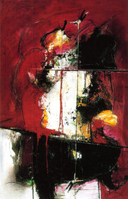 Une suite de gestes qui ne s'expriment, comme ceux de la danse - discipline avec laquelle l'artiste entretient des liens étroits -, que dans la continuité du mouvement s'accommode mal de toute tentative d'explication. Hors la poésie, le langage est toujours un carcan qui fixe des idées et des images. Activité nécessaire, mais dont il faut savoir reconnaître les limites. C'est pourquoi, autant et quoi que l'on puisse en dire, les œuvres de Jean Gaudreau ne vous apprendront rien au sens habituel et immobile du terme « savoir », Si leur présence mouvante est importante, c'est parce qu'elles sont prétexte à réflexion. Elles déclenchent et excitent l'imagination de chaque regardeur qui peut, dans son propre rêve, infléchir tel ou tel geste de l'artiste en regard de sa propre mouvance. De Colombine roucoule sur ses amours retrouvées, par exemple, l'artiste nous dit que « ce personnage de la commedia dell'arte laisse voir son visage dans la masse blanche située au milieu à droite. Ses yeux semblent fermés, mais sa bouche est ouverte sur un message. La sécurité du bleu, la passion du rouge et le secret du noir peuvent évoquer le retour de l'amour dans sa vie. » Combien d'entre nous peuvent alors rêver de leur propre passé ou de leur avenir. .. Mais, plus important encore, combien d'entre nous peuvent s'interroger sur l'inquiétude qui nous gagne en l'absence de réponse. Une inquiétude qui devient, et qui est peut-être déjà, le seul sens de l'existence et du monde ...•